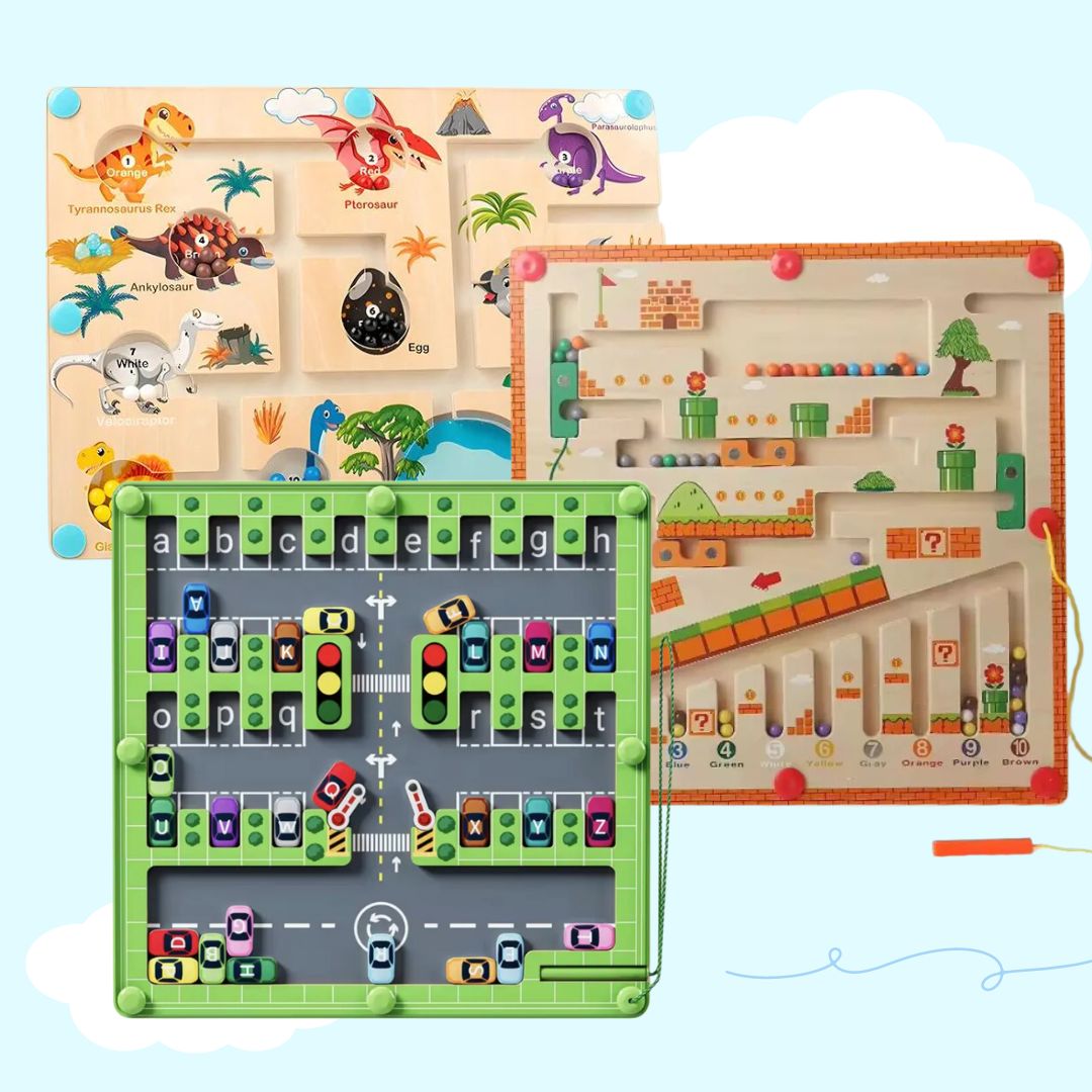 Kids use a magnetic wand to guide colorful letters, numbers, or shapes through mazes, matching them to the right spots.